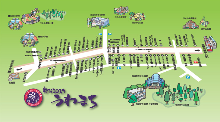 看板建築を模した銅版葺きのアーケードを持ち、うわまち病院ほか沢山の医療機関、明るい子供達の声が絶えない幼稚園、小高い丘に位置する小学校、図書館を有する地域に根付いた商店街です。